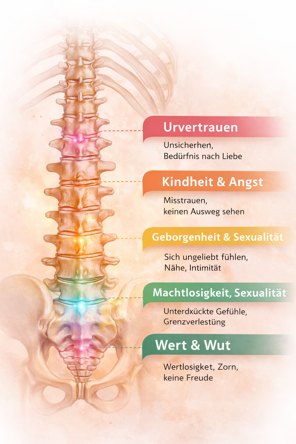 Gerade die Lendenwirbelsäule ist oft ein Bereich, in dem sich tiefe Themen zeigen. Dazu gehören Grenzverletzungen, Erfahrungen von Missbrauch, alte Verletzungen aus deiner Kindheit oder Dinge, die du lange unterdrückt hast.